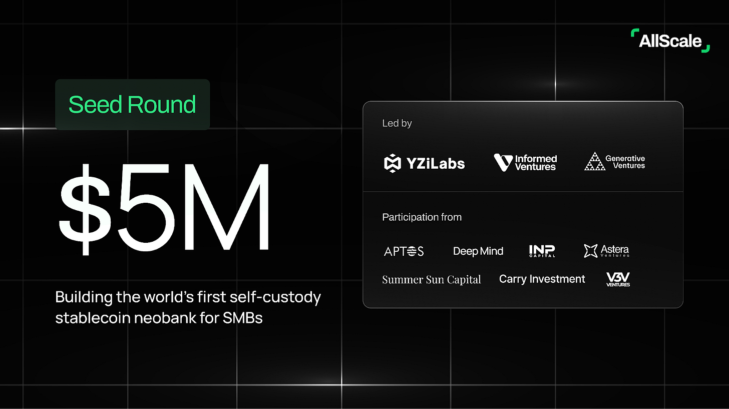 AllScale announced a $5 million Seed round led by YZi Labs, Informed Ventures, and Generative Ventures to build the world’s first self-custody stablecoin neobank for global microbusinesses.